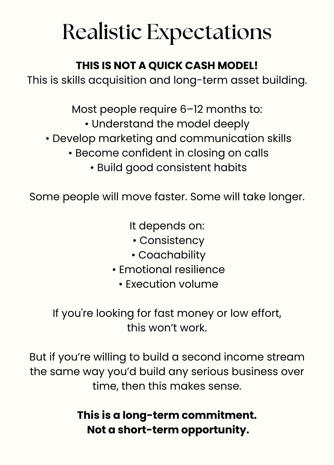 This isn’t a “quick money” fix. Think of it as a 12–18 month vehicle designed to build skills, structure, and momentum. Some people start seeing traction in the first 3–6 months when they show up consistently, learn the system, and apply what they’re taught. Others take longer and that’s normal.