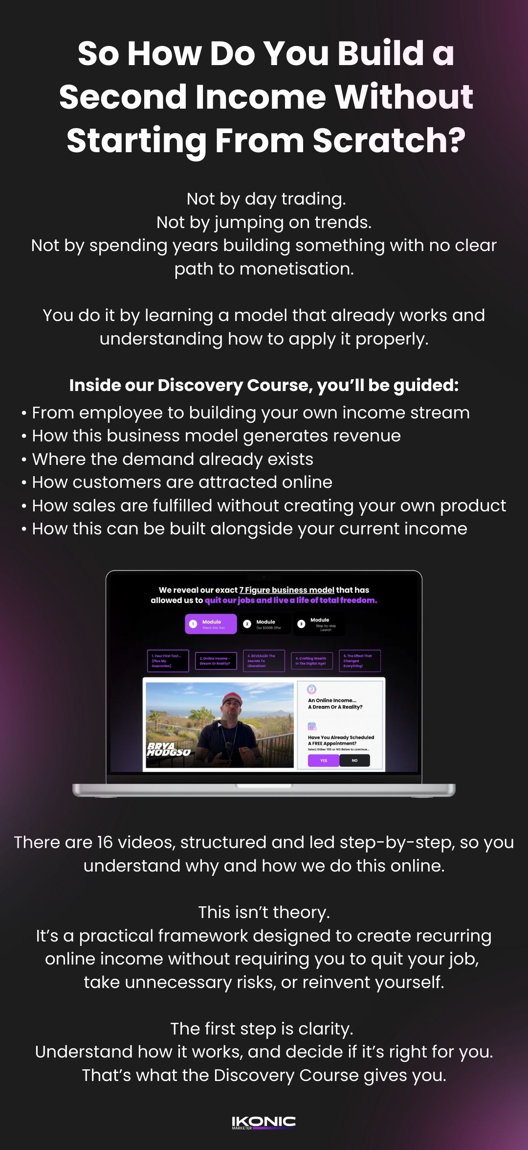 The Discovery Course was created to give order you a clear understanding of the business model we use, why it works, and how people build a second income online alongside their current job so they can create options for the future without risking their stability right now.