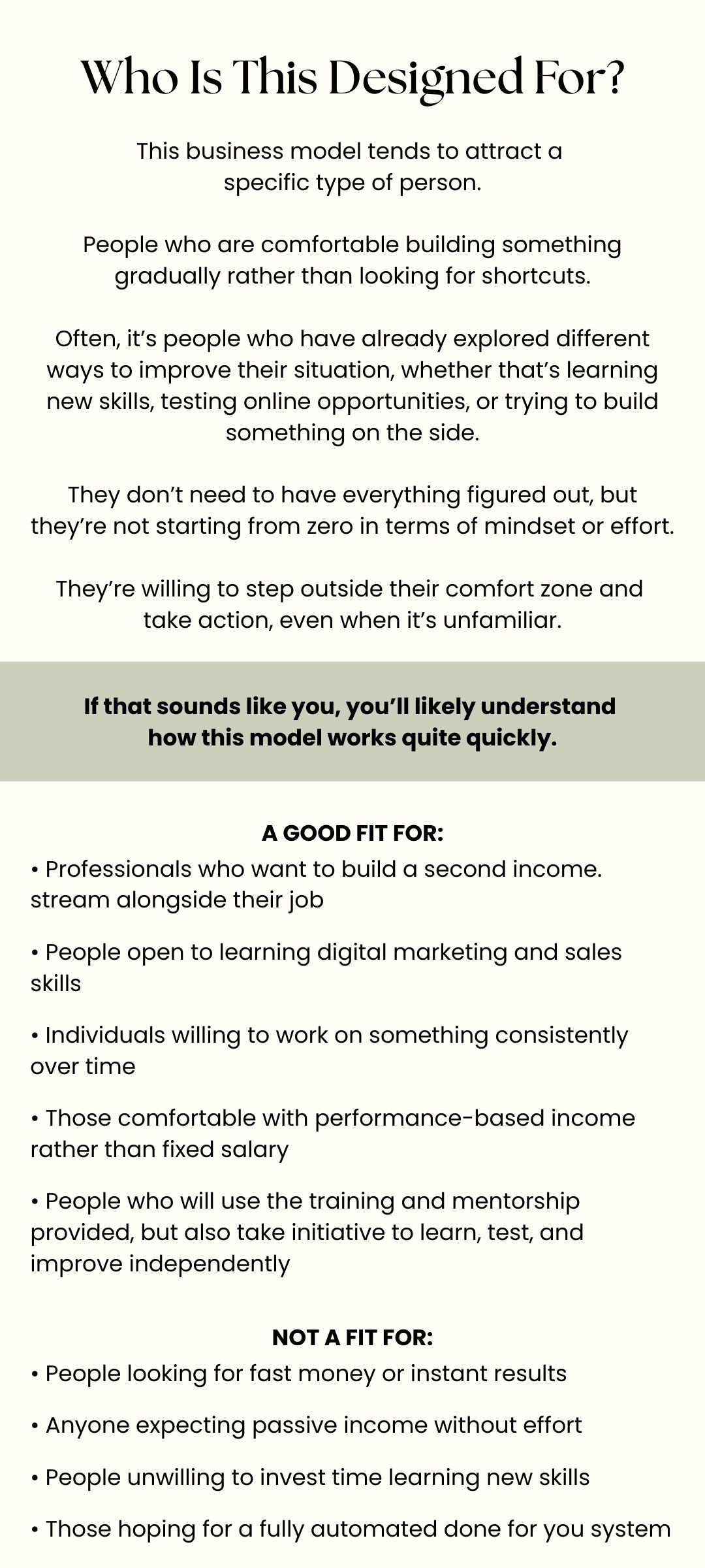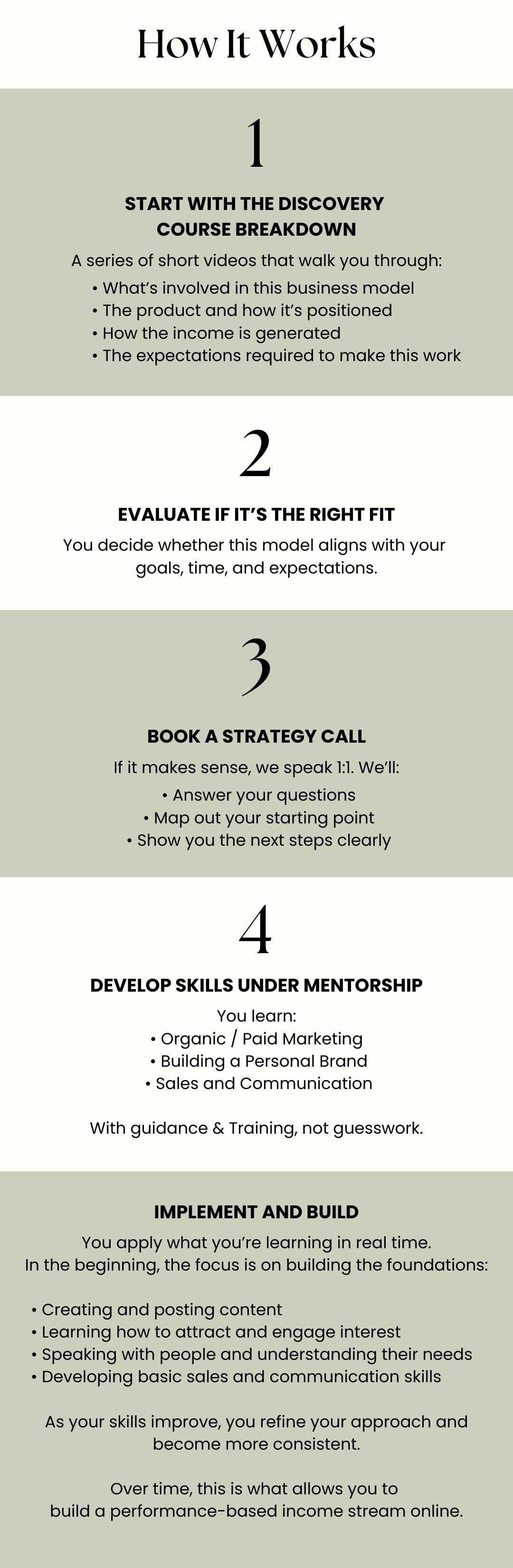 If you want the real picture, the Discovery Course will show you exactly what the business model looks like, how it works, and what your role would be in a way that actually makes sense.